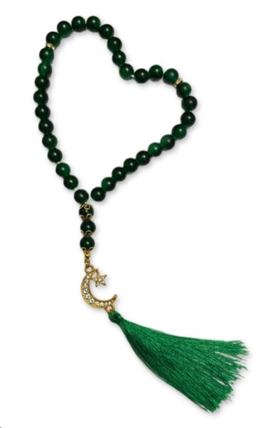 Амулет подвеска мусульманский каменные зеленые бусы, с полумесяцем (золото)