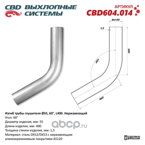 Изгиб трубы глушителя (труба d55, угол 60, длина 250) нерж.