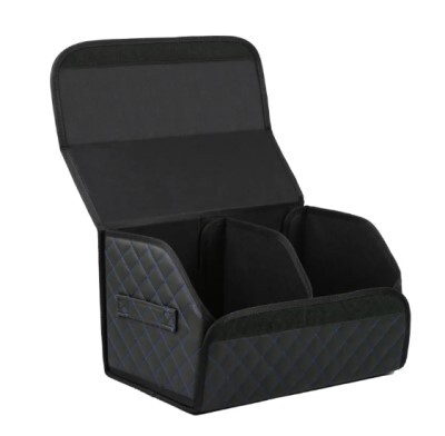 Органайзер в багажник 50х31х29см экокожа /черный с двойной синей строчкой/ саквояж (на замке)