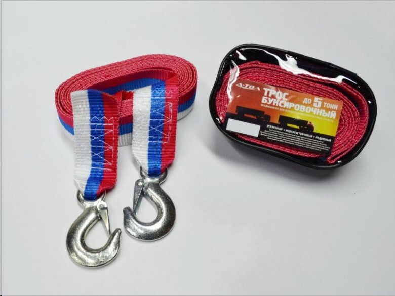Трос буксир. (5 т) лента 2 крюка /4,5 м/ усилен.+перчатки в сумке
